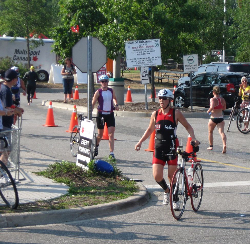 Coming back into the residential area, we wound our way through tight streets and I found myself among a few other athletes. Turning into the coned-off lane to the dismount line - a no-passing zone - I was on the brakes hard trying to stay back when I actually heard someone on the sidelines (a Triathlon Ontario official?) comment "Is that 5 metres ladies? It looks a little tight". Miffed at being accused of drafting when I was trying my damndest not to run over the timid descenders in front of me did nothing for my sense of humour, but I managed to dismount safely in spite of people stopping right in front of me and made the run through the enormous transition area to my rack.