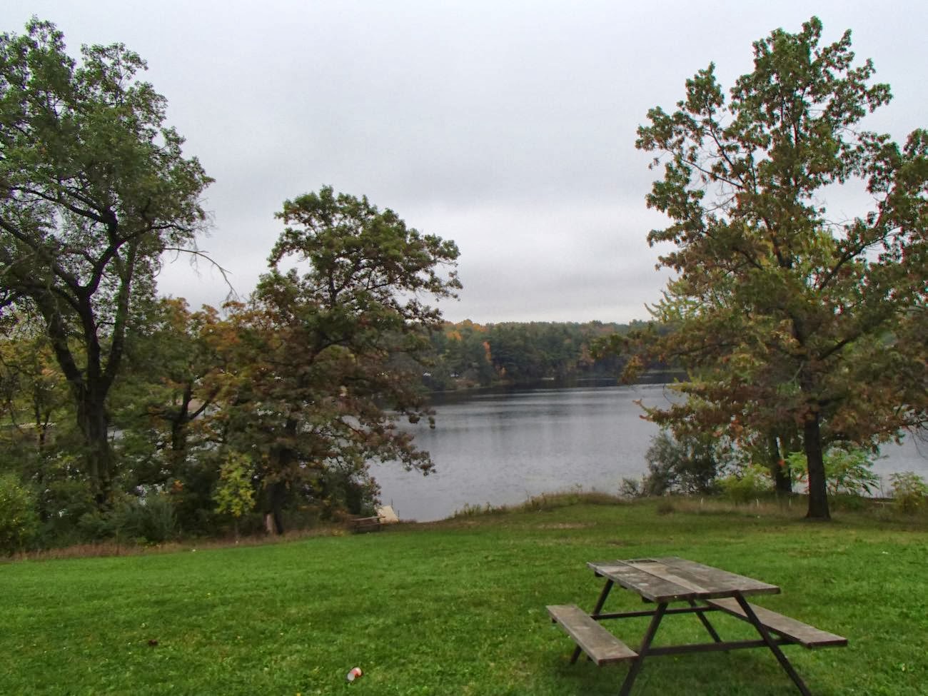 Down the hill, around the pond and into the woods - even the first lap made it clear that this year was going to be as bad as, if not worse than, last year's mudfest. The big stinkin' hill was impassable from the get-go; we had to use the left side, where there are some fallen branches and lots of leaves to provide some traction rather than the bare mud face. That's right - wet, fallen leaves actually provided more grip than the proper path. I did see some people make it up the main trail here, but they were few and far between. By the second lap the mud was as bad as it had been by the 3-hour mark last year, and I resolved that my best approach would probably be to run every single inch of the course that was runnable now in order to bank as much mileage as I could for when it became impossible to do anything but walk later on.