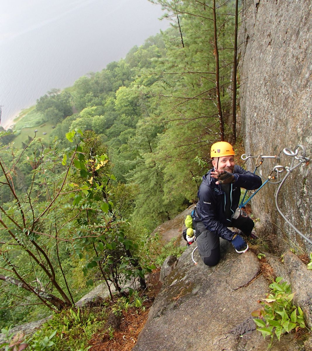 Miraculously, it had finally stopped raining! When everyone had reached the ledge and Guillaume had explained the best way to move along it (clip carabiners to the lower of the two overhead lines, then walk with a hand on either side; one person per section of lifeline, and the usual "only unclip & move one carabiner at a time" when crossing into a new section), I got on my way.