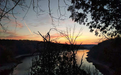 I don't even know if these falls have a name - Dee asked if this was the "Hilton Falls" for which the park is named, but that's further along and not actually a part of the 25k/50k course. We hit them at a gorgeous time, though, with the rising sun turning streaks of cloud into fiery brands across the sky over Kelso.